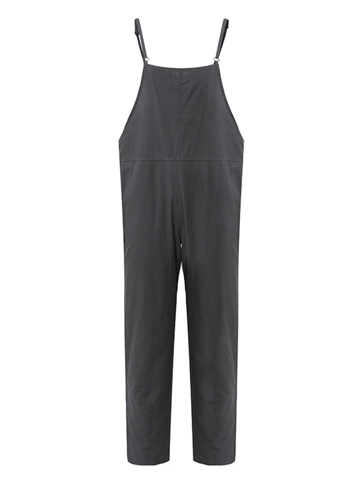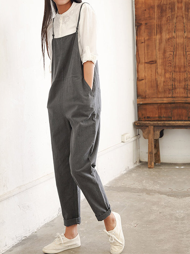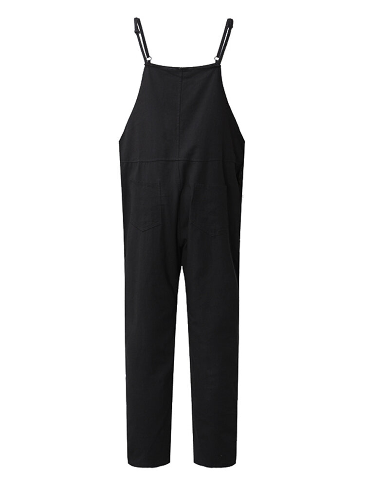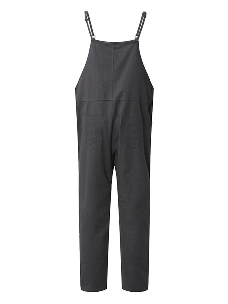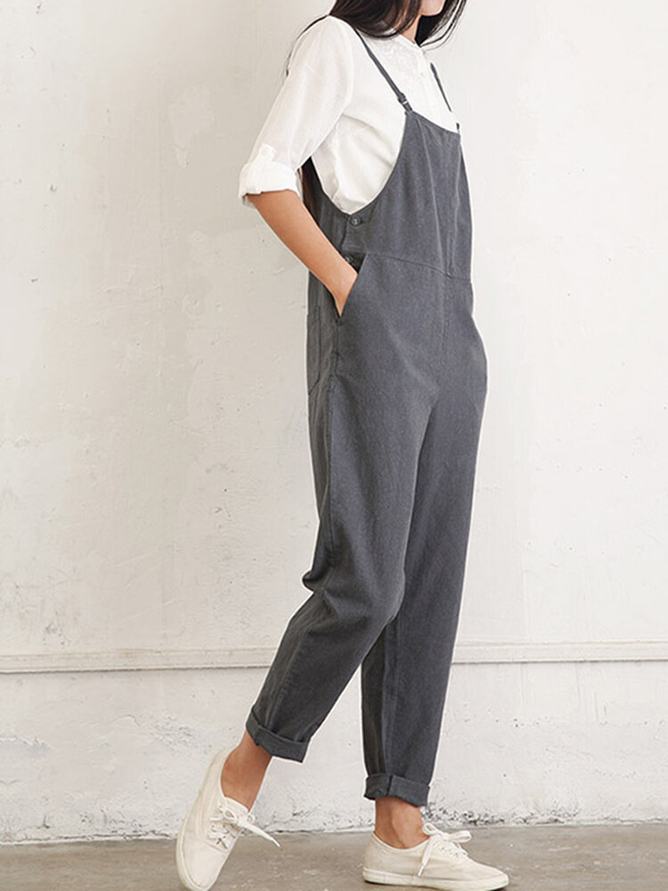 Casual Women Pure Color Side Button Strap Cotton Overalls