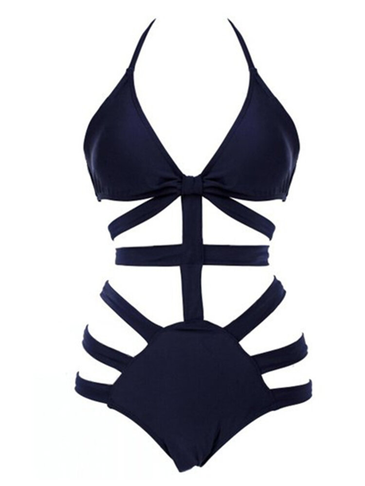 Sexy Halterneck Black Blue Cut Out Bandage One-Piece Monokini Swimming Wear